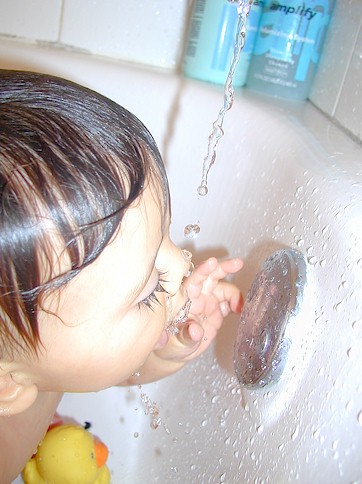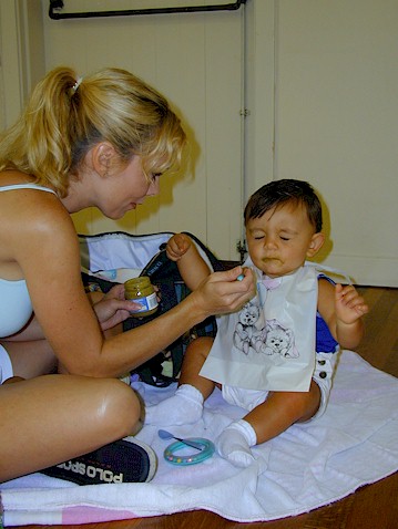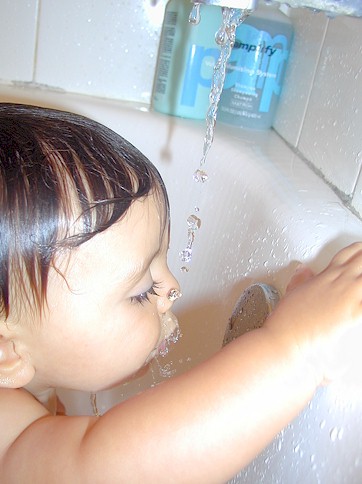 Nicholas officially began crawling on June 1st. He's very pleased with himself. We're thinking of installing a Lojack tracking device on him. He now has eight teeth and is eating solid food. Another shower scene